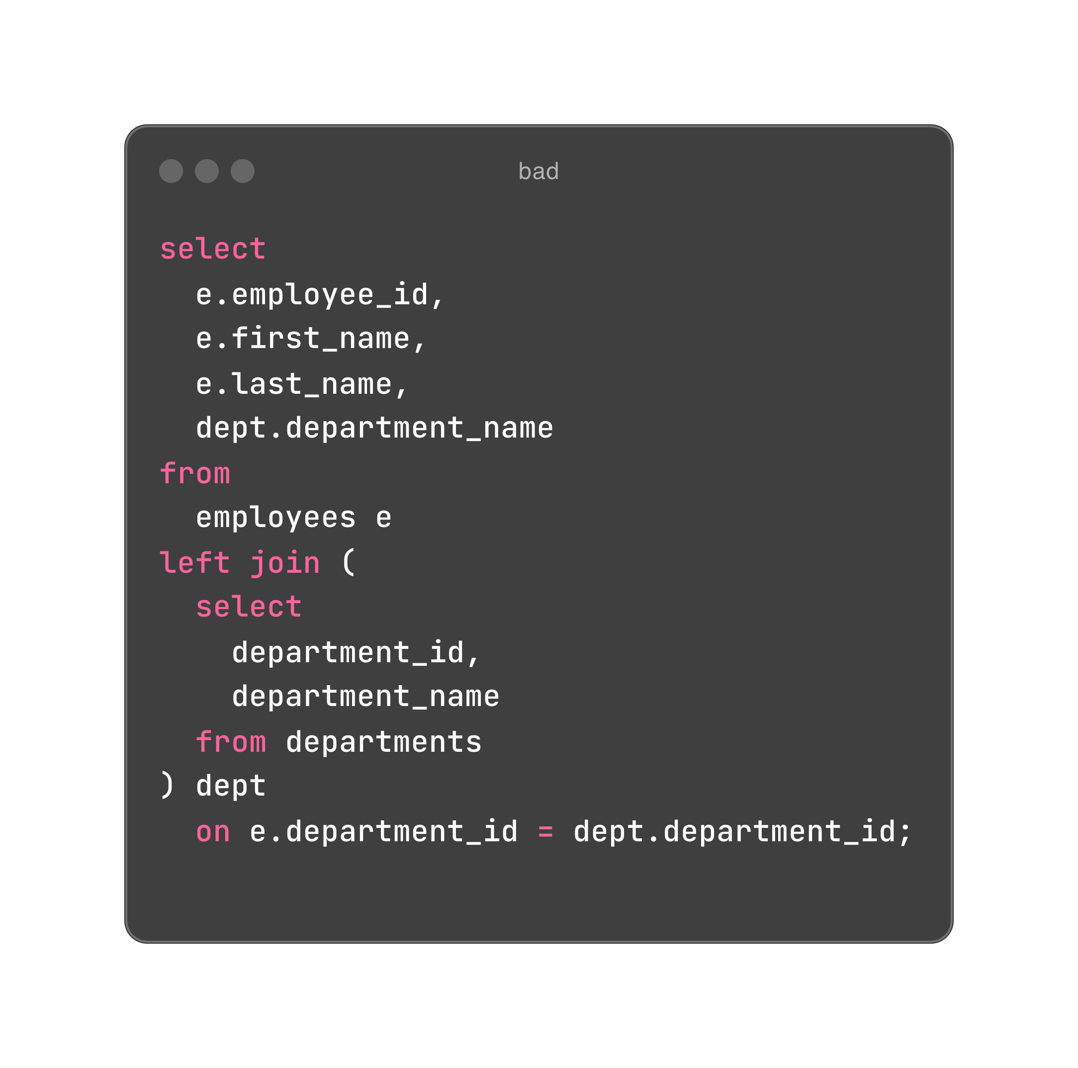 One common habit I see among people new to SQL is relying heavily on subqueries. While subqueries get the job done, they often make the code difficult to read - especially when nested subqueries are involved.