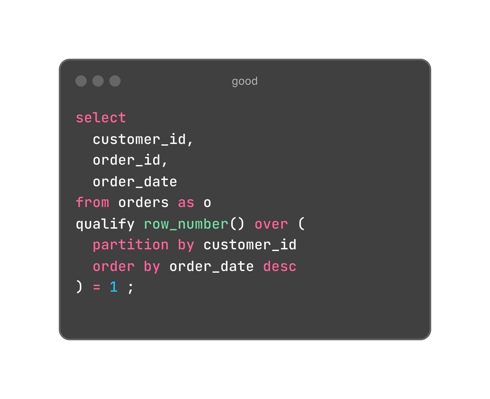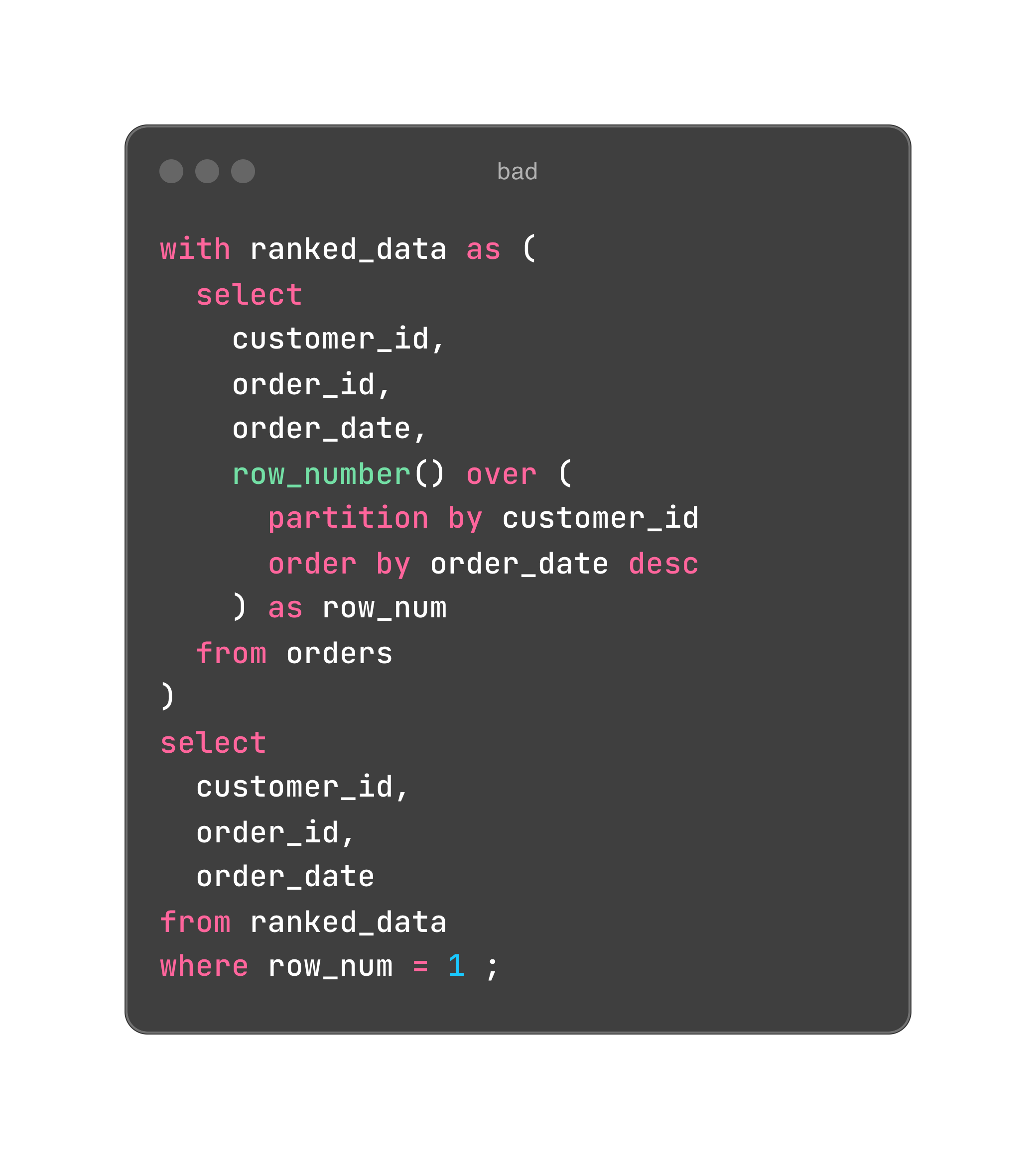 If you want to deduplicate your dataset or filter based on window functions for other purposes, you would typically create a subquery or, preferably, a CTE. In this approach, you define the window function in one CTE and then filter on it in the next CTE or the final SELECT statement.