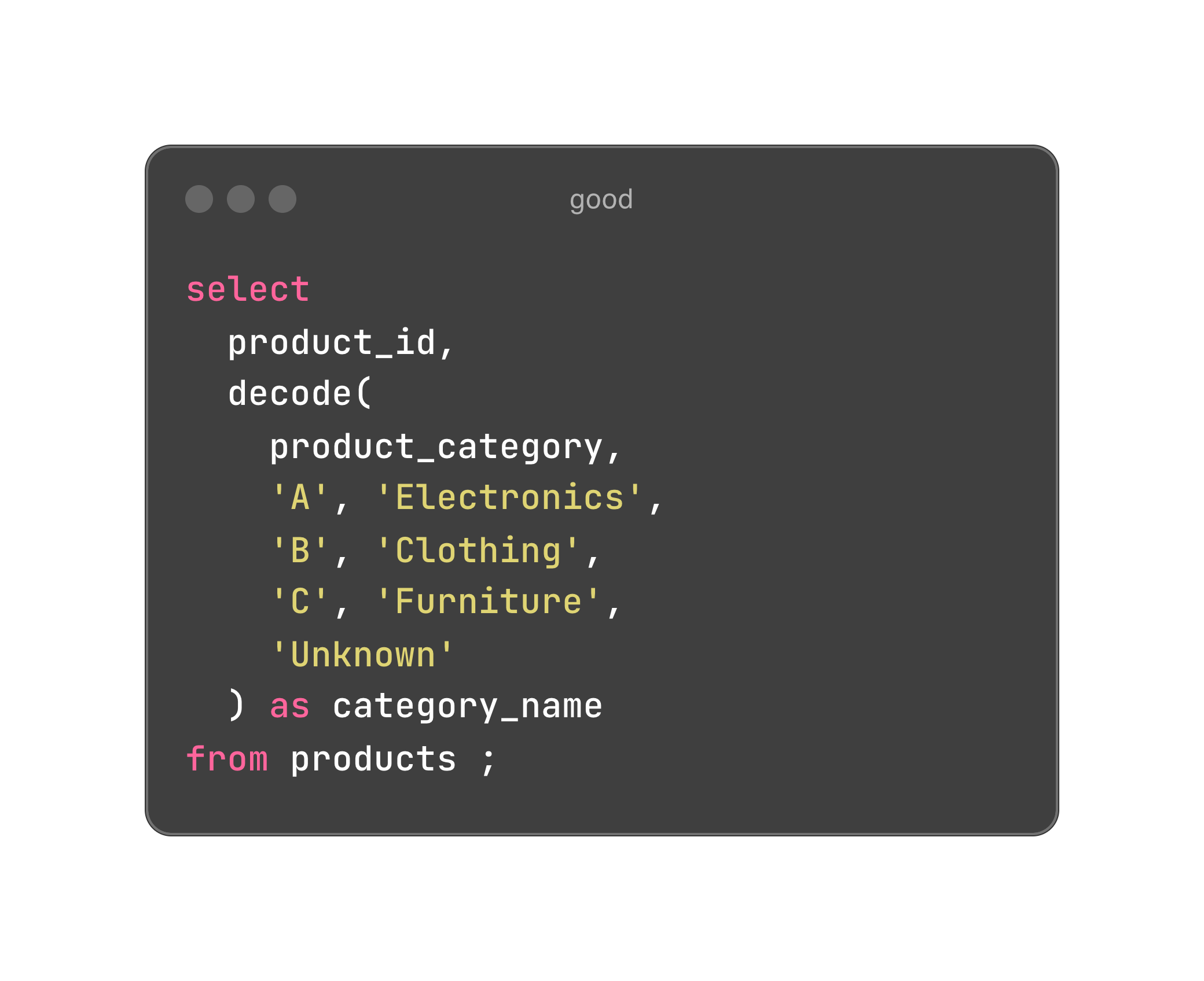 Disclaimer: In many cases, it’s better to store the mapping in a dedicated mapping table rather than embedding the mapping logic directly in your code.