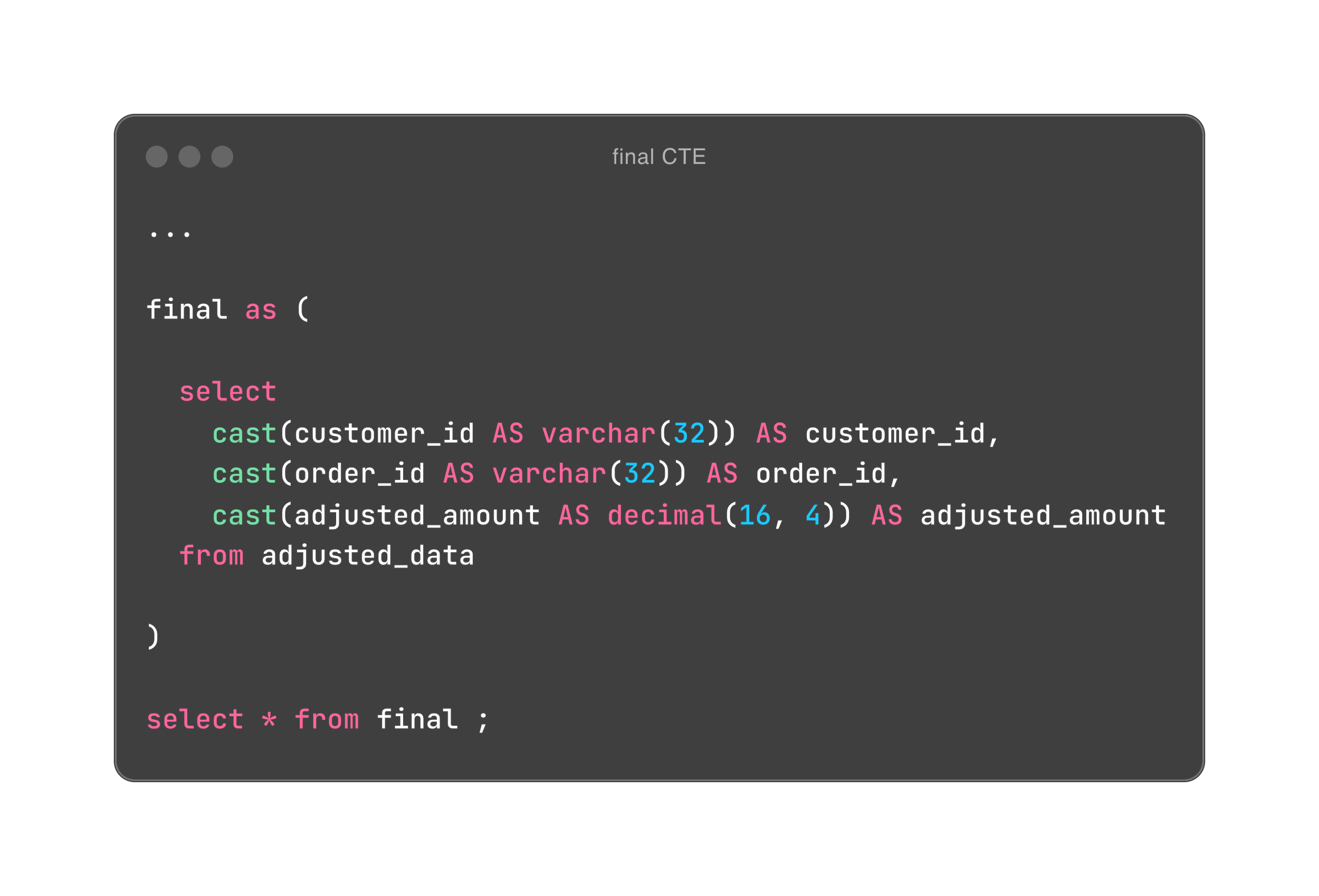 In these scenarios, it’s helpful to include a final CTE that explicitly defines all columns with the correct names and data types. This approach provides clarity about the expected columns and their formats, even in queries spanning hundreds of lines. It can save you significant time and frustration when revisiting the SQL query later.